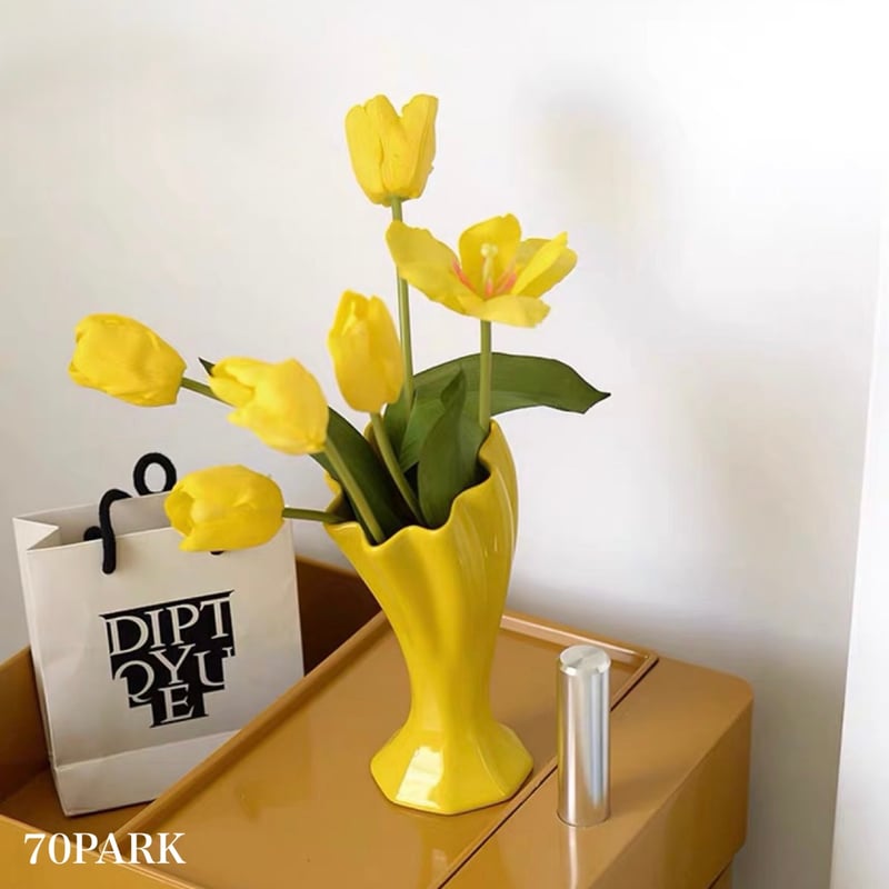 AM80 イタリア製 アート.デコ 花瓶 フラワーベース 飾花瓶 飾物 イエロー イエロー トランペット型 セラミック フラワーベース 花瓶 | 70PARK