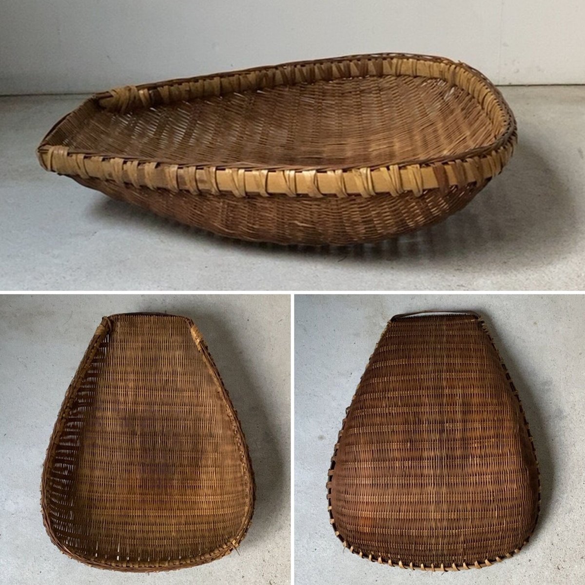 | 商品の特徴 | 片口ざる 入れ子3点セット ヴィンテージ 箕ざる 竹編みザル 竹工芸。竹製 片口ざる 箕 レトロ 竹製 片口ざる 箕 レトロ。スズ竹箕ざる(片口ざる) | 虎斑竹専門店 竹虎。小ぶりの品物ですので各種演出にいかがですか片口ざる2点と箕(み)1点の3点セット①片口ざる(サイズ(約))・33㎝×31㎝×11㎝・29㎝×27㎝×10㎝②箕・サイズ(約):23㎝×29㎝×7㎝長期保管による劣化や手作りによる小傷があることをご理解ください状態等の詳細は写真でご確認くださいご覧いただきありがとうございます。竹製片口ざる箕レトロ。 | ||